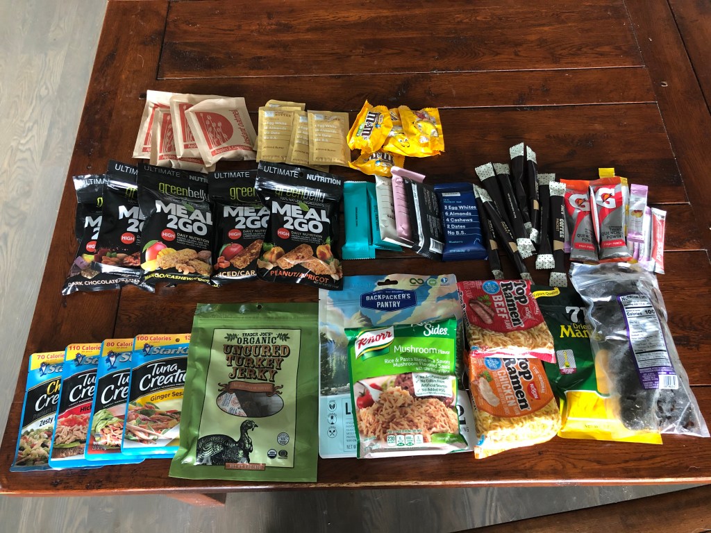 Snacks: dried fruit, jerky, Rx Bar, peanut M&M’s